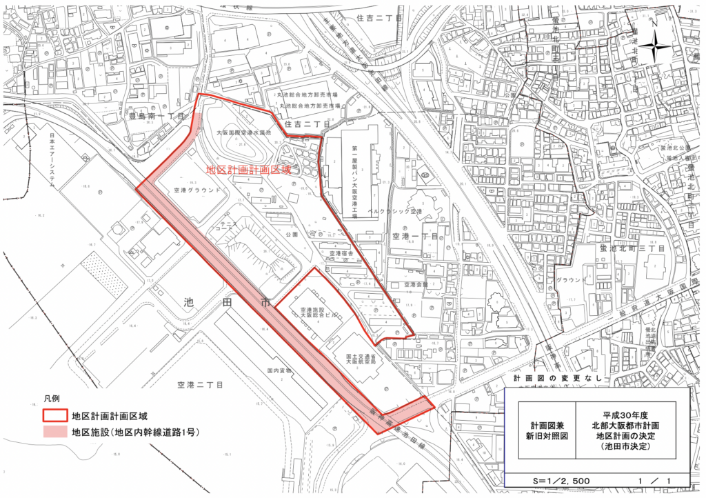 ””大阪国際空港北側に位置する空港官舎の跡地利用とそれに隣接する低・未利用地の有効利用について、地域のポテンシャルを生かし、地域に相応しい適切な機能が導入されるよう、流通業務施設や工場等の立地を適切に誘導し、雇用の創出を図るとともに、みどり豊かな空間を創出し、良好な都市環境を形成するため、地区計画を決定しました。””